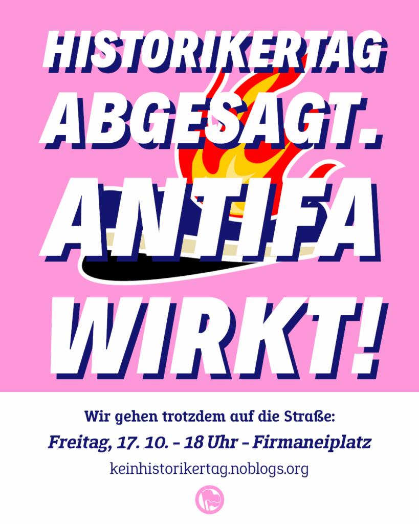Lasst uns gemeinsam auf der Straße den Erfolg der Absage feiern und trotzdem kämpferisch klar machen: Antifaschismus bleibt notwendig! Kommt mit uns am Freitag, den 17. Oktober um 18 Uhr auf die Straße. Beginn der Demo ist auf dem Firmaneiplatz neben der Elisabeth-Kirche.